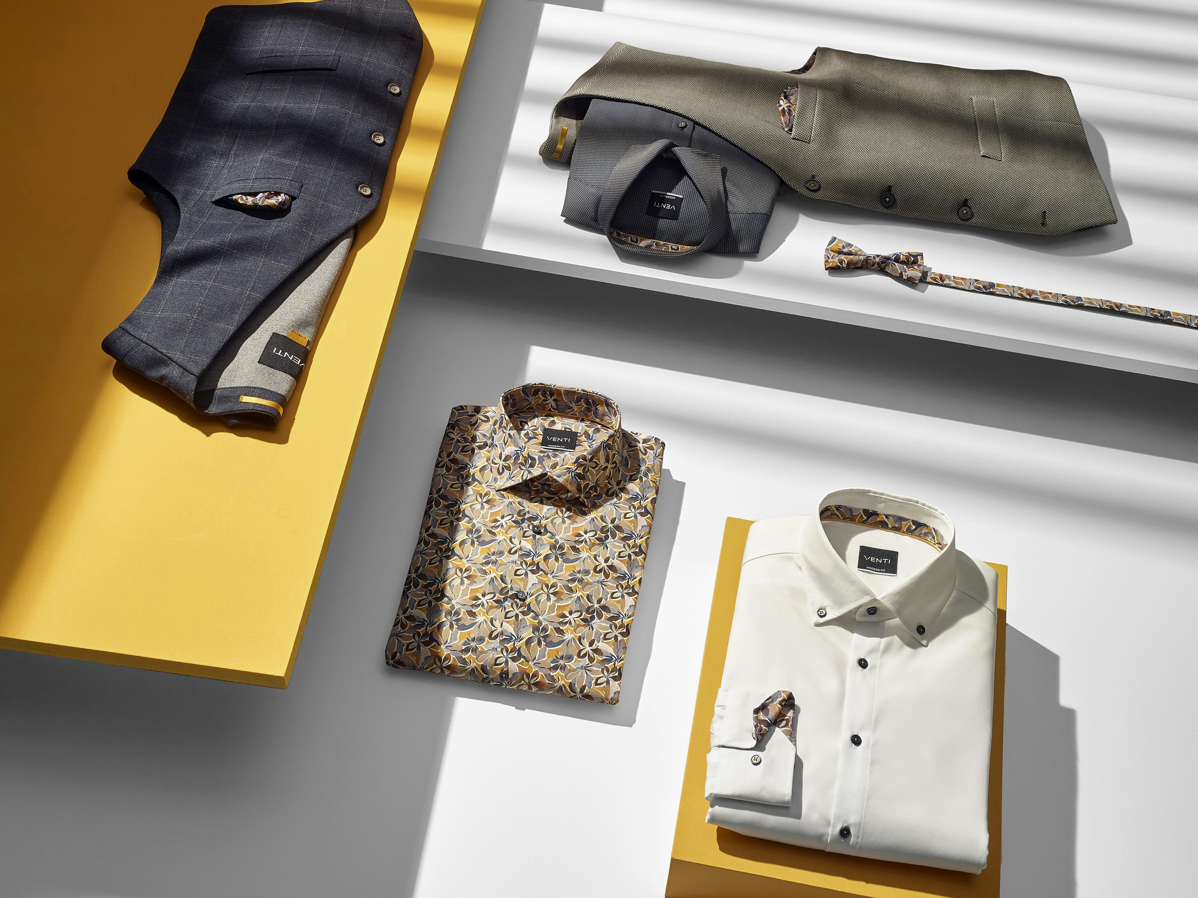 Unsere neuen Sakkowesten und Businesshemden aus der aktuellen VENTI Frühjahrskollektion sind ideale Kombinationspartner. Die wiederkehrenden Designelemente sind durch das Einstecktuch, den Hemdumschlag oder der passenden Fliege perfekt aufeinander abgestimmt.
