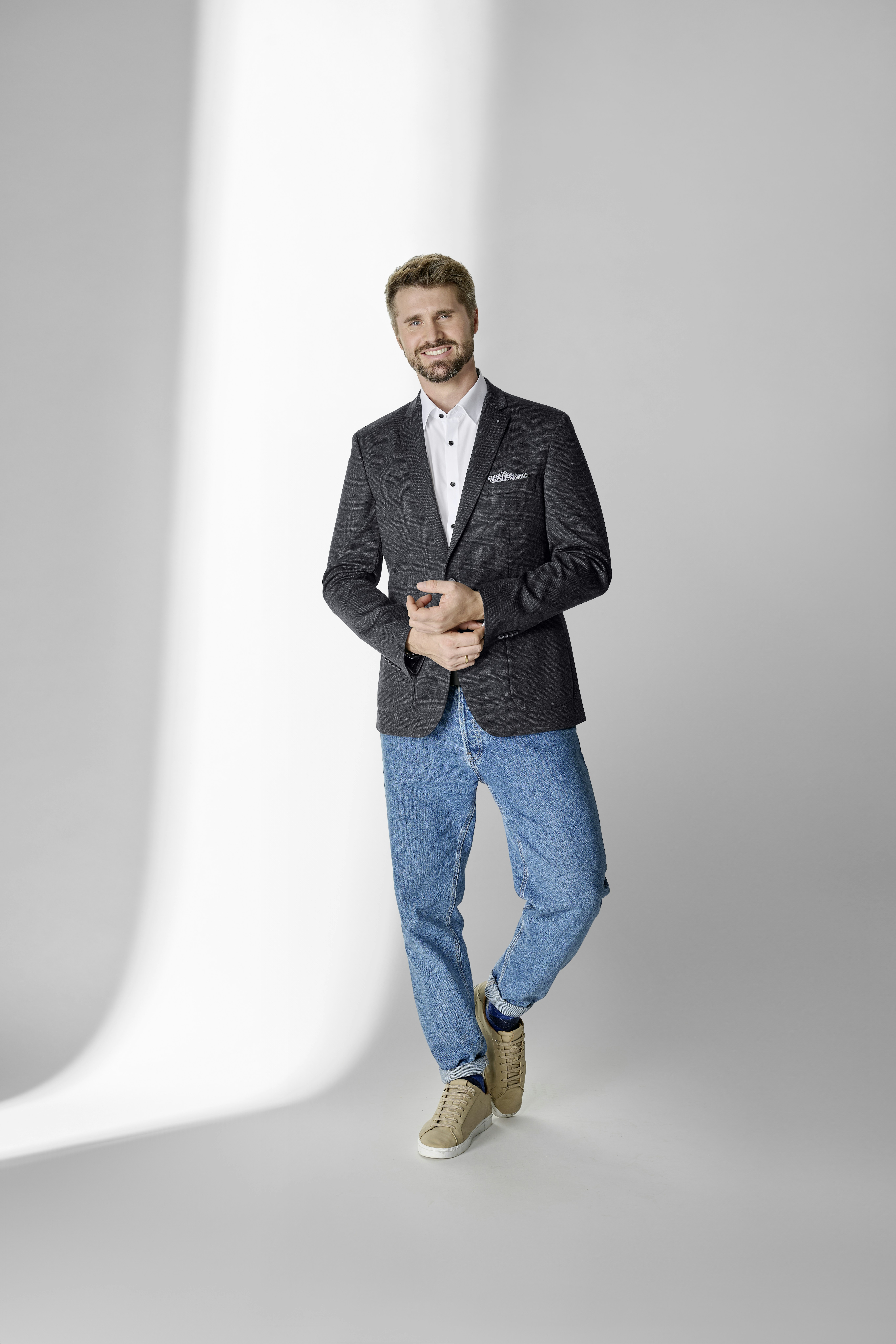 • Thore Schölermann präsentiert eine blaue karierte Hemdjacke von VENTI